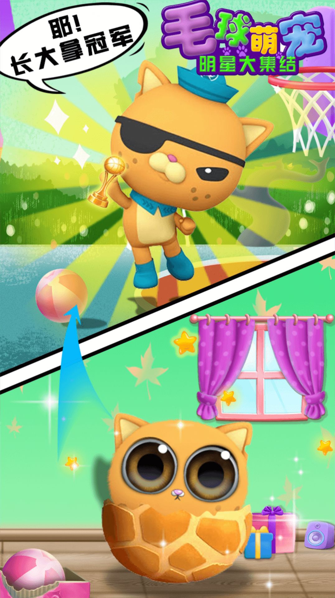 2、多个独立设计的小游戏,你可以陪毛球宠物们一起玩玩具、给它们换装,还能和他们一起玩跳一跳和篮球游戏;