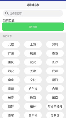 支持自动定位当前城市,也可手动添加或切换其他城市,覆盖国内外众多热门城市。