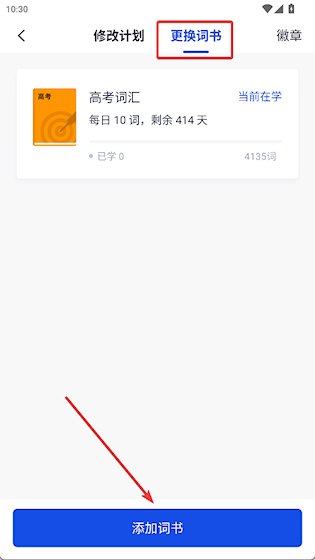 2、点击上方“更换词书”,然后点击下方“添加词书”