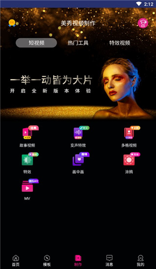 美秀视频制作是一款专业的视频编辑应用,集多种功能于一身,可以轻松制作卡点视频,添加酷炫转场、特效贴纸,能使用海量视频模板一键生成契合主题的视频作品,让视频内容更加丰富多彩。