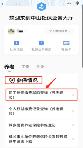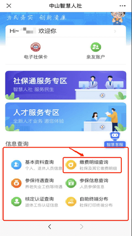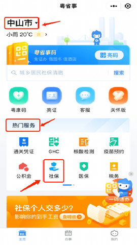 登录“粤省事”小程序,城市选择“中山”,身份认证后在“热门服务”里点“社保”一栏进入可自助查询,如图所示: