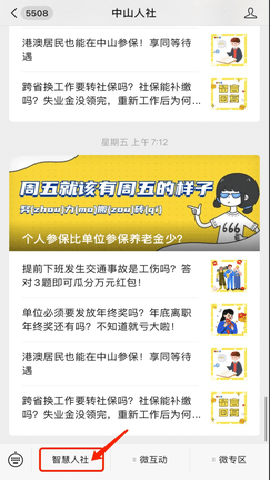 关注微信公众号“中山人社”后,点击“智慧人社”,认证登录后可自助查询,如图所示: