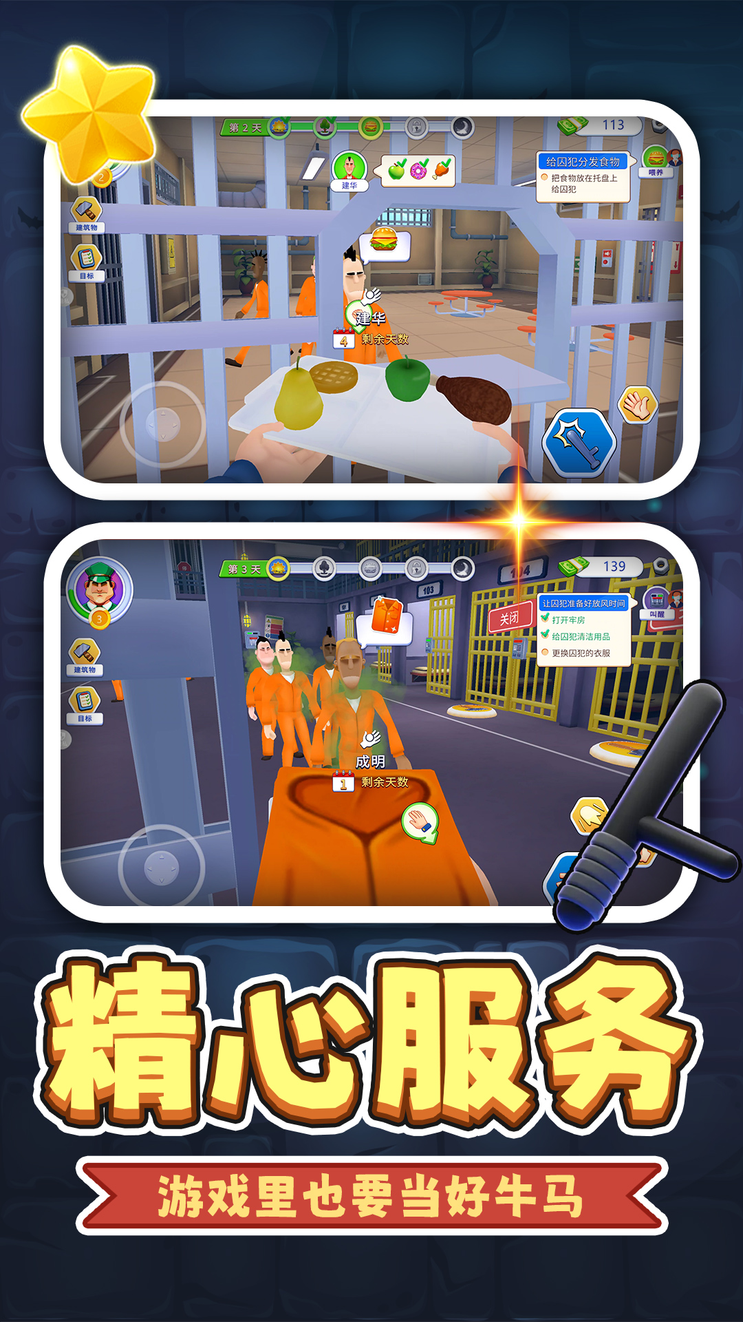 一个大魔王游戏:管理好监狱里面的犯人,到点就给他们发放食物,如果发现有犯人在里面干坏事,可以将他单独关起来。当夜幕降临的时候,玩家要提高警惕,隔一段时间就要用探照灯看一下牢房里面的情况,防止有犯人趁着夜色越狱!