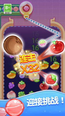 1、玩家通过调整角度与力度发射彩色球球,击中屏幕上方同色或特定图案的方块,触发消除连锁反应;