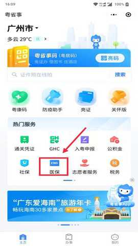 第一步:实名认证登录粤省事小程序,找到【医保】,如图所示: