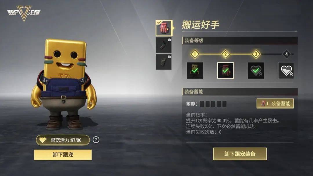 此外,砖友们还可以对跟宠的装备进行【装备蓄能】,提升相应的技能属性,获得更强的增益效果。完成每周任务或者进入商城获取【蓄能装置】,就可以提升跟宠的装备等级。跟宠的装备越强,就越能够在对局中发挥更大作用,成为我们的得力开金助手!