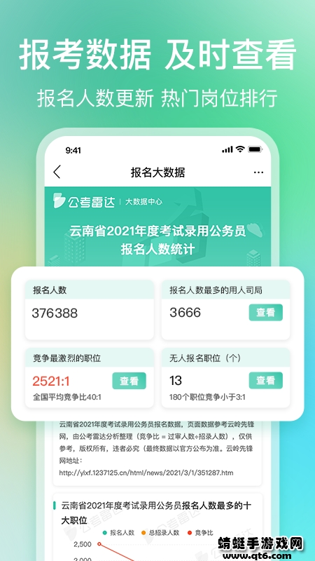 3、雷达大数据中心,全面分析职位竞争热度,并提供热门考试报名人数,进面分数线在线查询;
