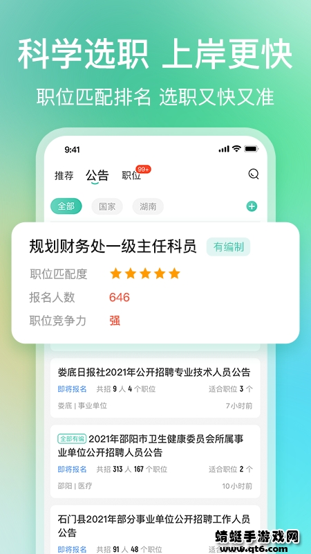 1、权威发布全国公职类(公务员、事业单位、教师、医疗、三支一扶、村官、遴选、选调、村官、招警等)报考公告、职位信息,根据简历信息迅速找到最适合的好职位。