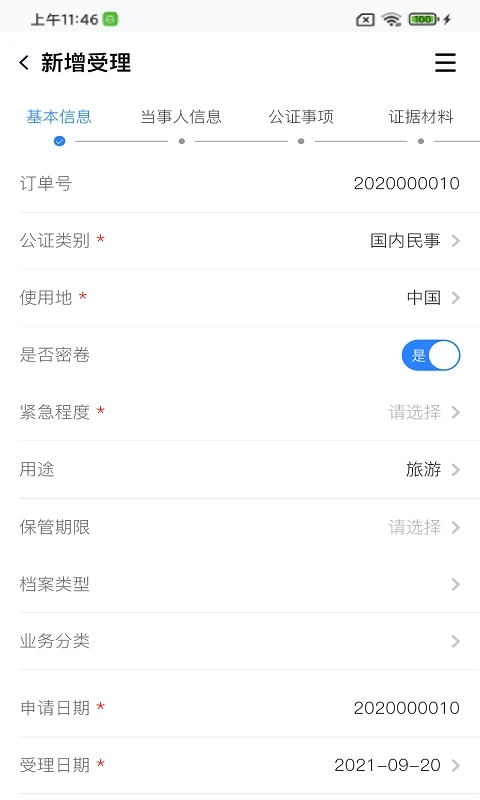 公证受理:公证人员可通过系统快速录入当事人信息、证据材料、公证事项、文书笔录,并严格按照流程规范办理公证受理事宜。