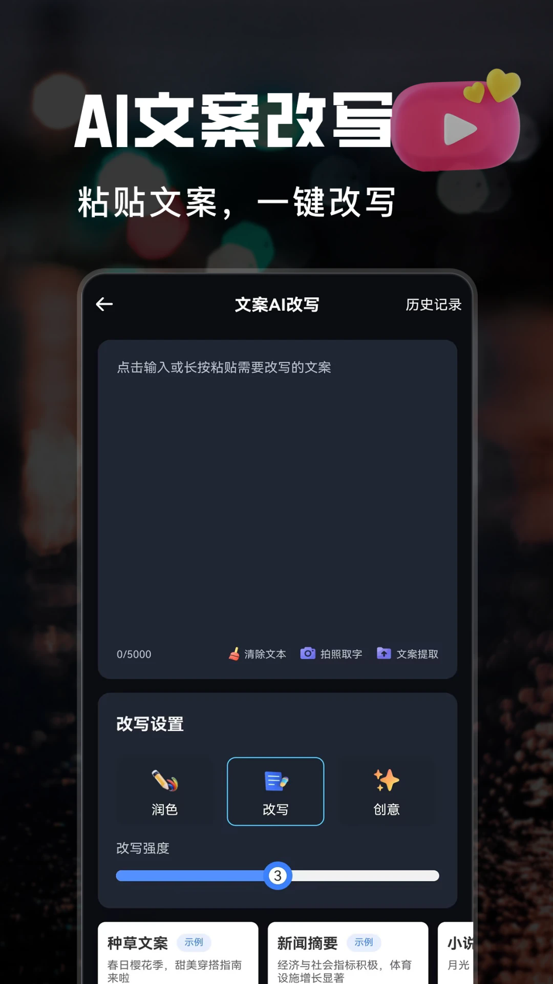 【AI文案】 生成与文本描述相关的创意文案,并根据用户选择的视频风格进行调整。