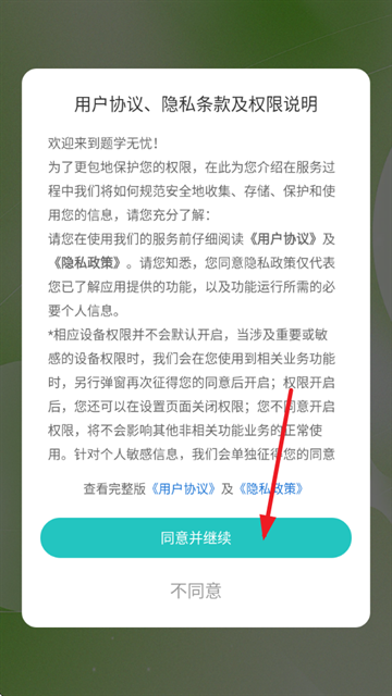 1、首先打开题学无忧app,阅读并同意《用户协议》及《隐私政策》;