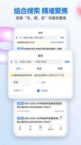3、可以按照行业、地区、企业或关键词分别来查找相关的招投标信息,同时还可以查建筑行业从业人员及资质情况。