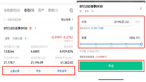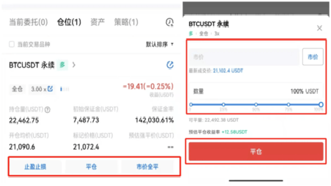 05 您可在持仓界面设置止盈止损,还可选择平仓,输入平仓价格和平仓数量确定平仓,或选择市价全平完成平仓操作。