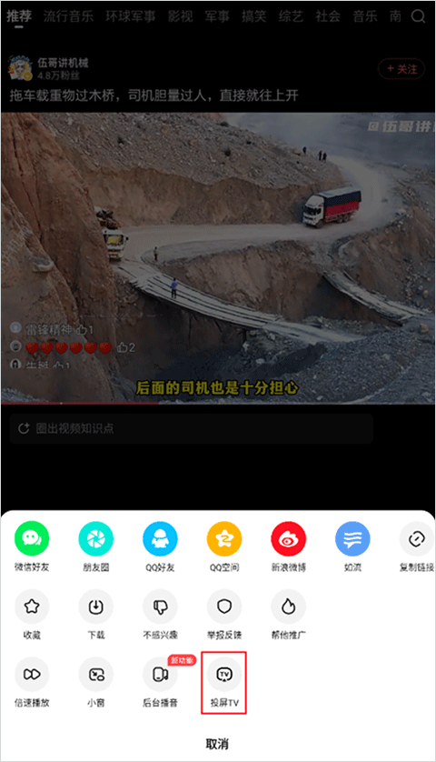 2、点击视频对应的分享图标"J“按钮,选择投屏tv即可。