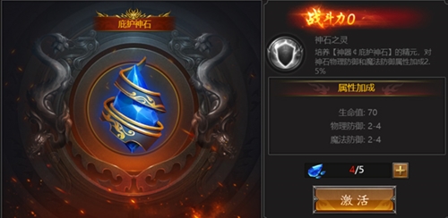 神石:消耗【神石碎片】提升等级。可通过黑市商城、野外BOSS、材料商店、每日特惠获取