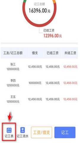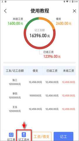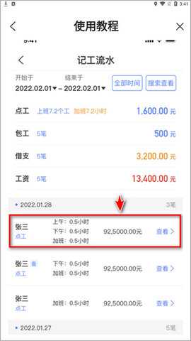 4、在记工流水可查看当前的流水,点击某条流水可查看详情并进行修改、删除。
