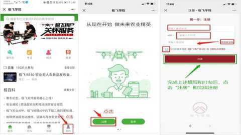 进入极飞学院公众号页面后,点击右下角“我的”→点击注册→填写资料→ 完成注册。