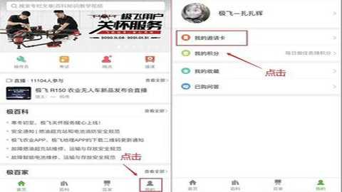 第一步:进入极飞学院后,点击右下角我的"--》我的邀请卡--》长按图片--》发送给朋友;