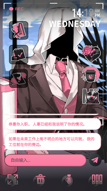 一款以异头人外为主题的全性向陪伴型手机功能软件,陪伴玩家的上班搭子,监督玩家完成任务的助手,伴随着更新解锁更多异头人外角色,每个角色都有其独特的完整剧情线,内置关键词解锁,可以根据关键词给出更多反应对话,今后也会不断完善,游戏玩法主要是:通过累积陪伴时长以及各种触发互动解锁更多场景内的不同配件,包括且不限于领带/头部/桌面好物/背景等。