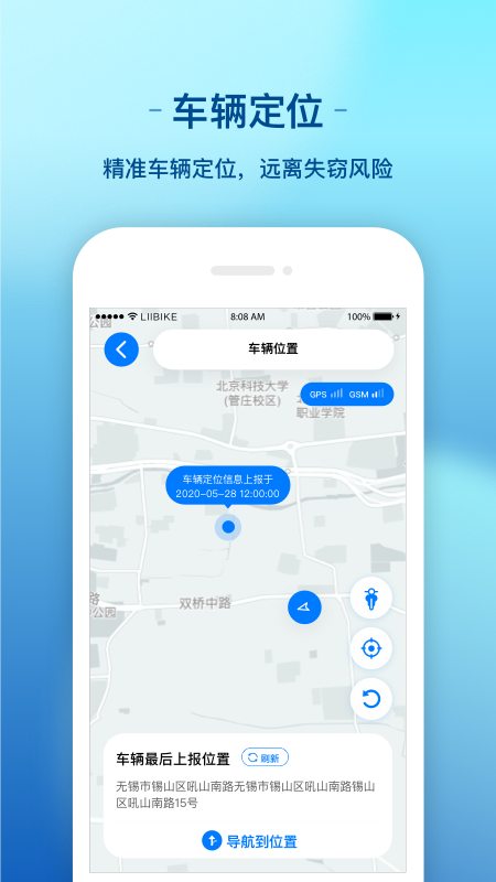 车况:准确电量、预估续航、车辆定位、车身状态、骑行轨迹等。